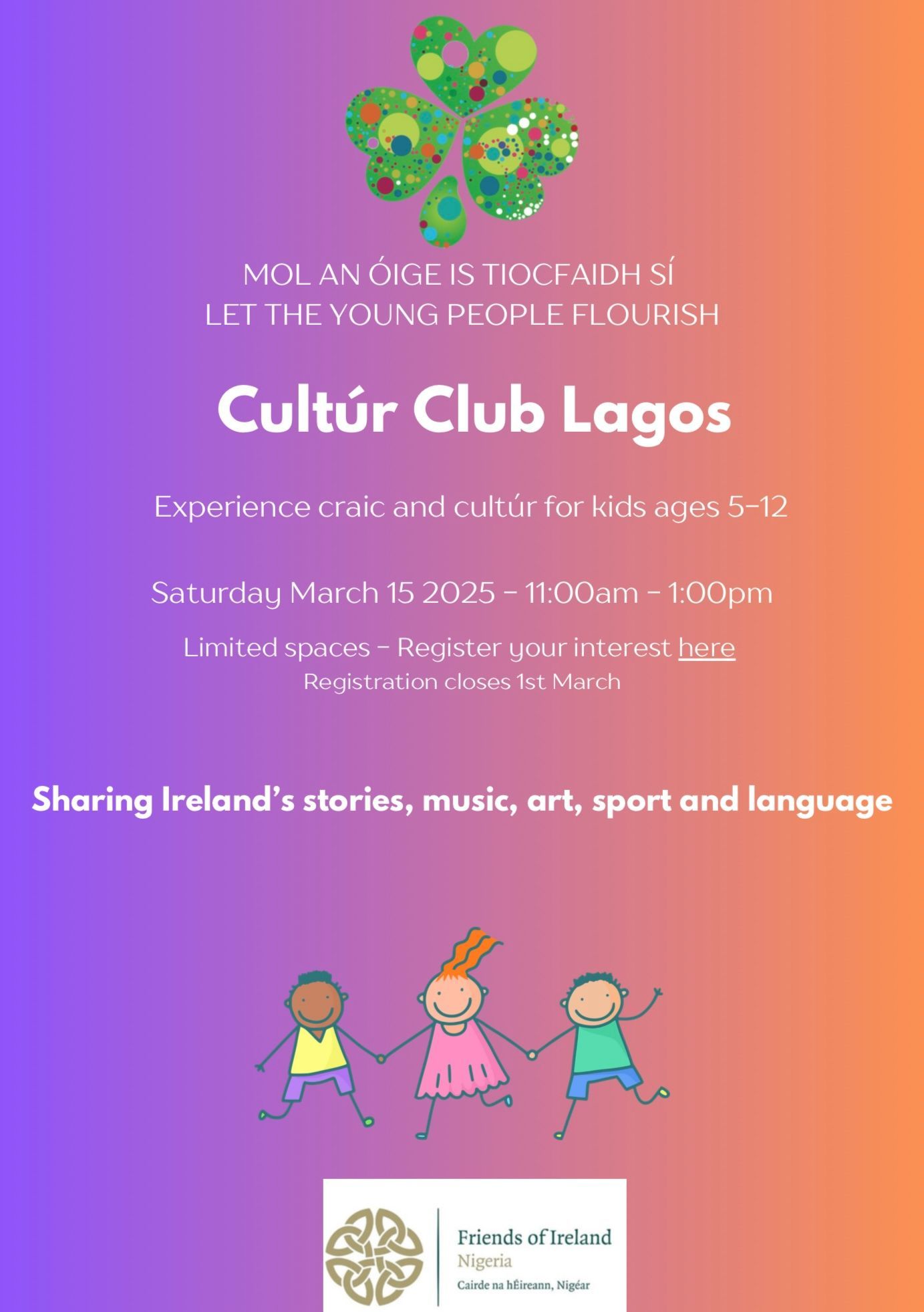 The Embassy partnered with the Friends of Ireland in Nigeria to host the very first Cultúr Club for children aged 5-12. The children enjoyed an exciting morning of Irish storytelling, art, dance, music and sport at the Priory Preparatory School, hosted by Mrs. Alice Dina. Thanks to Ms. Aduke Gomez for her storytelling and to Nathan, Ronan and Colm, our visiting Irish musicians and dancer for making the Club so memorable for the children. Looking forward to many more such Cultύr Clubs. As we say at home - Mol and óige is tiocfaidh sí – Let the youth flourish.